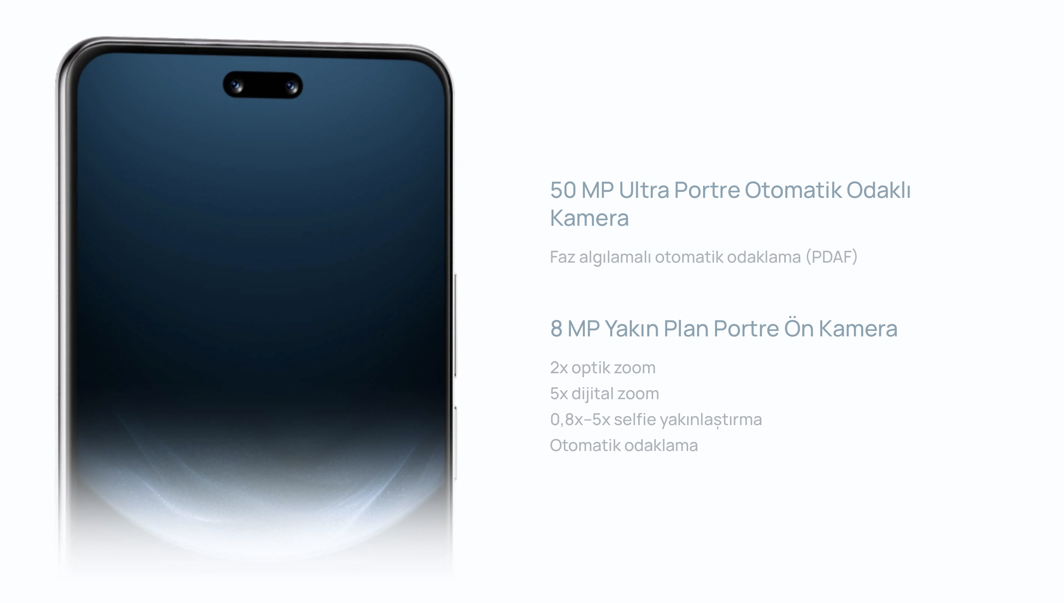 -50 MP Ön Ultra Portre Çift Kamera (F2.0) +8 MP Yakın Çekim Portre Ön Kamera (F2.2)