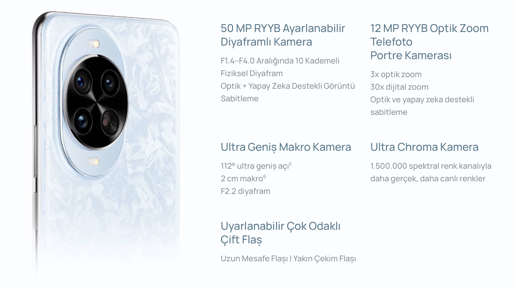 -50 MP RYYB Ayarlanabilir Diyaframlı Kamera + 12 MP RYYB Optik Zoomlu Telefoto Portre Kamerası + 8 MP Ultra Geniş Makro Kamera + 1.500.000 spektral kanallı Ultra Chroma Kamera