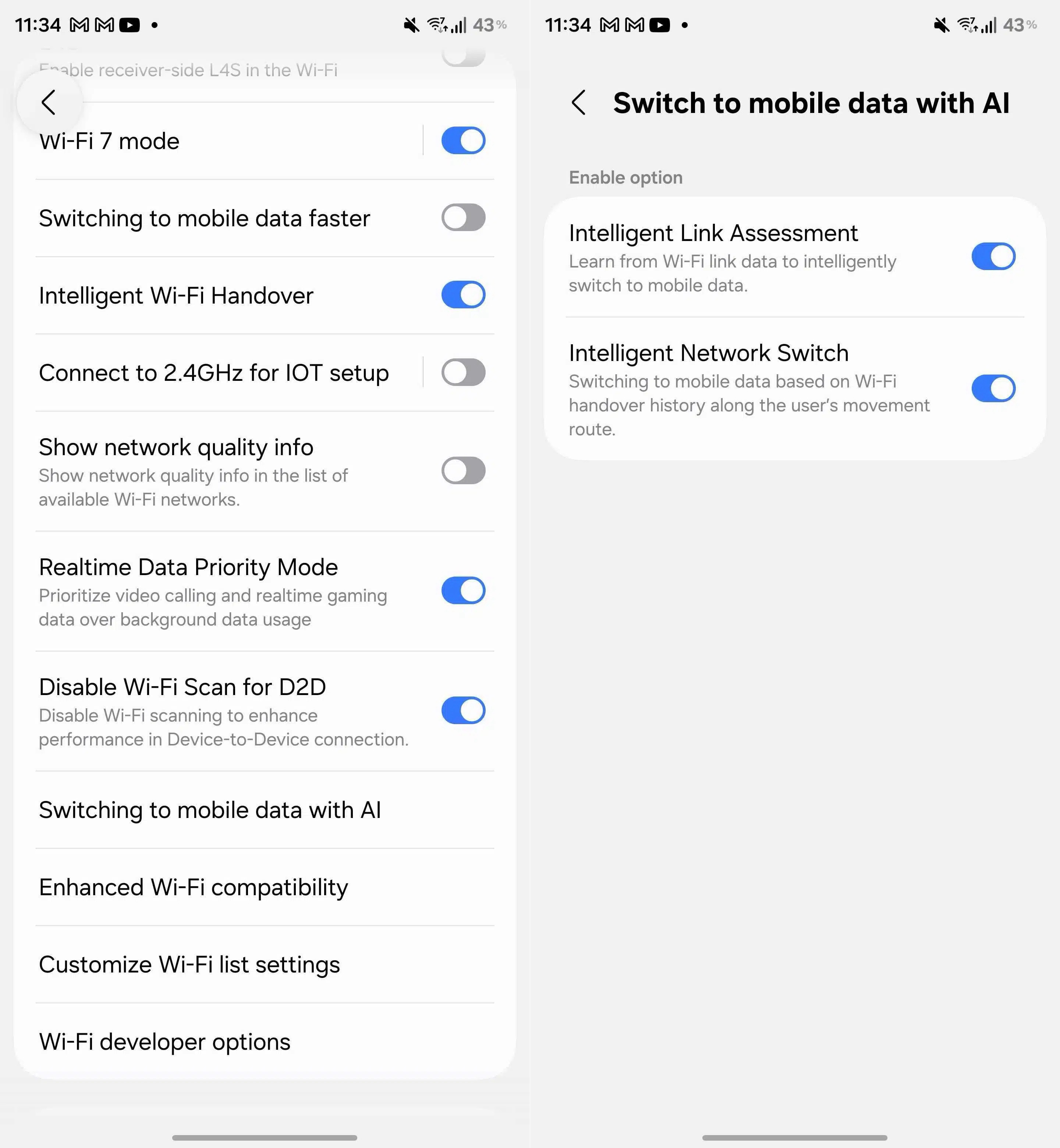 One UI 8.5, ağ kararlılığını ve geçiş verimliliğini artırmaya odaklanan yeni Wi-Fi irtibat seçenekleri sunuyor. Intelligent Link Assessment, Wi-Fi sinyal kalitesini gerçek vakitli olarak izliyor ve Wi-Fi irtibatı zayıfladığında ya da kaybolduğunda aygıtı otomatik olarak taşınabilir dataya geçirerek kesintisiz irtibat sağlıyor. Intelligent Network Switch, Wi-Fi sinyalinin ekseriyetle güvenilmez olduğu yerlere bağlı olarak, WiFi’dan taşınabilir bilgiye ne vakit geçileceğini iddia etmek için geçmiş Wi-Fi geçiş datalarını ve kullanıcı hareket modellerini kullanıyor.