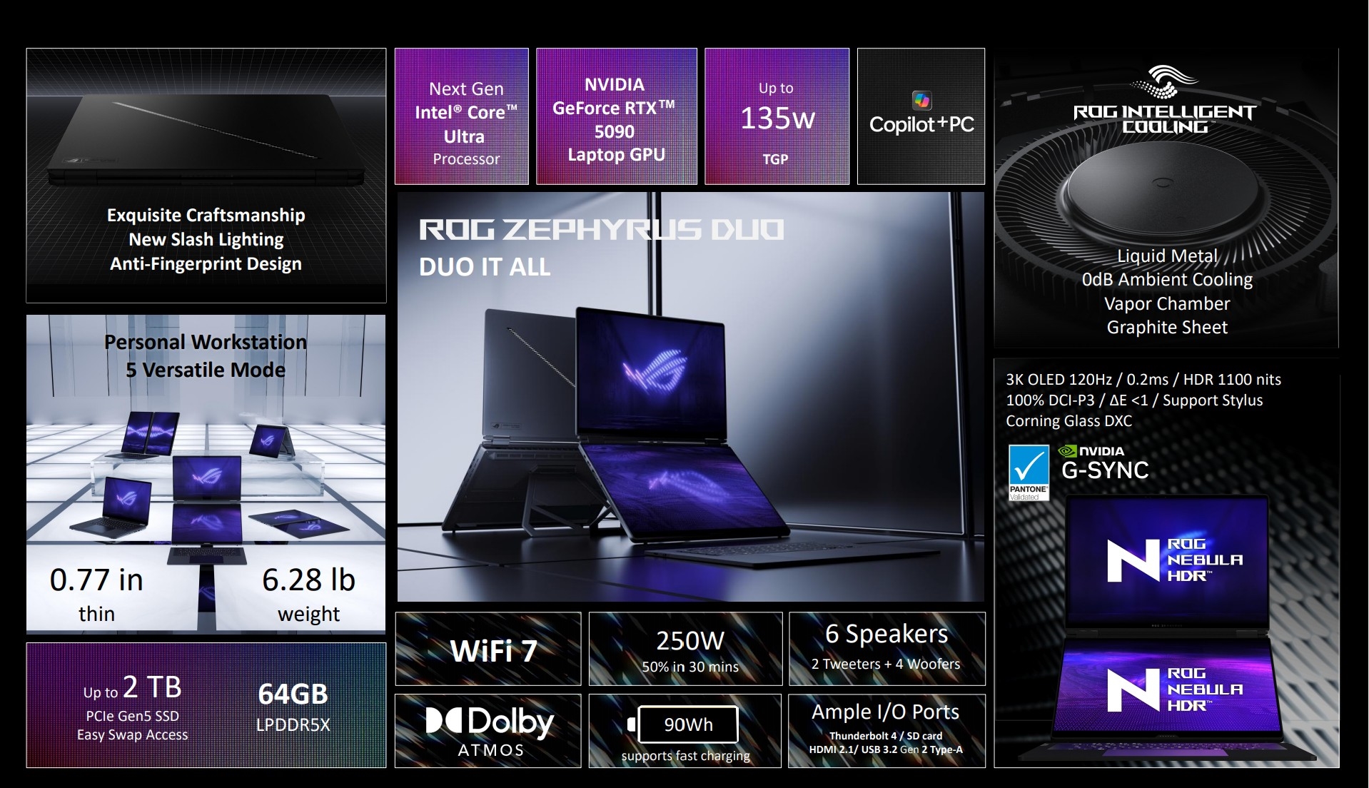 Asus’un en dikkat cazip modellerinden biri olan ROG Zephyrus Duo 16, yeni jenerasyonda Intel Panther Lake platformuna geçiş yapıyor. Asus, işlemcinin model ismini açıklamasa da, 16 çekirdekli bir yapıdan kelam ediliyor ve bunun Core Ultra X9 388H olması bekleniyor. 2023 modelinde AMD Ryzen 7000 işlemciler kullanılıyordu. Grafik tarafında ise Nvidia’nın Blackwell mimarili GeForce RTX 50 serisi tercih edilmiş durumda. Model, RTX 5070 Ti ve RTX 5090 seçenekleriyle sunuluyor. Lakin bellek ve depolama konusunda esneklik hudutlu. RTX 5090’lı sürüm 64 GB LPDDR5x RAM ve 2 TB depolama ile gelirken, RTX 5070 Ti versiyonu 32 GB RAM ve 1 TB SSD ile yetiniyor.
