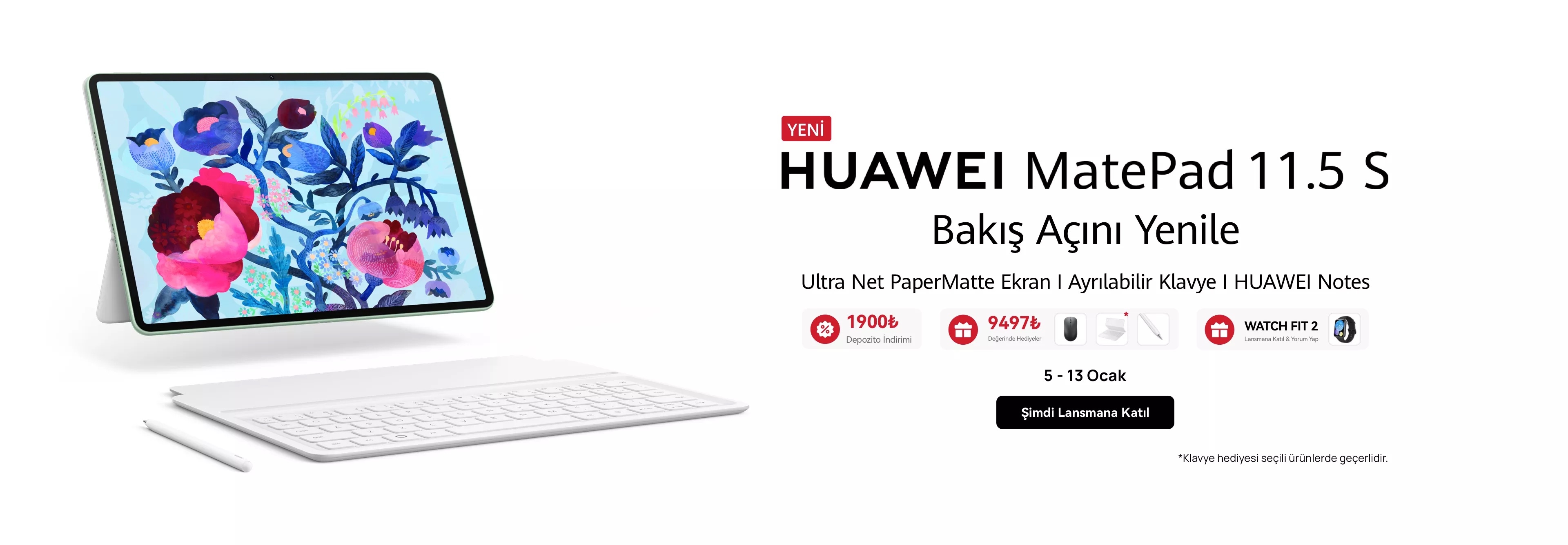 Huawei’in yeni tableti MatePad 11.5 S 2026 için lansman kampanyası başladı. 14 Ocak’ta ön siparişe sunulacak tabletin yanında klavye, Mouse ve WATCH Fit 2 armağan ediliyor. Fiyatı 14 Ocak’ta muhakkak olacak
