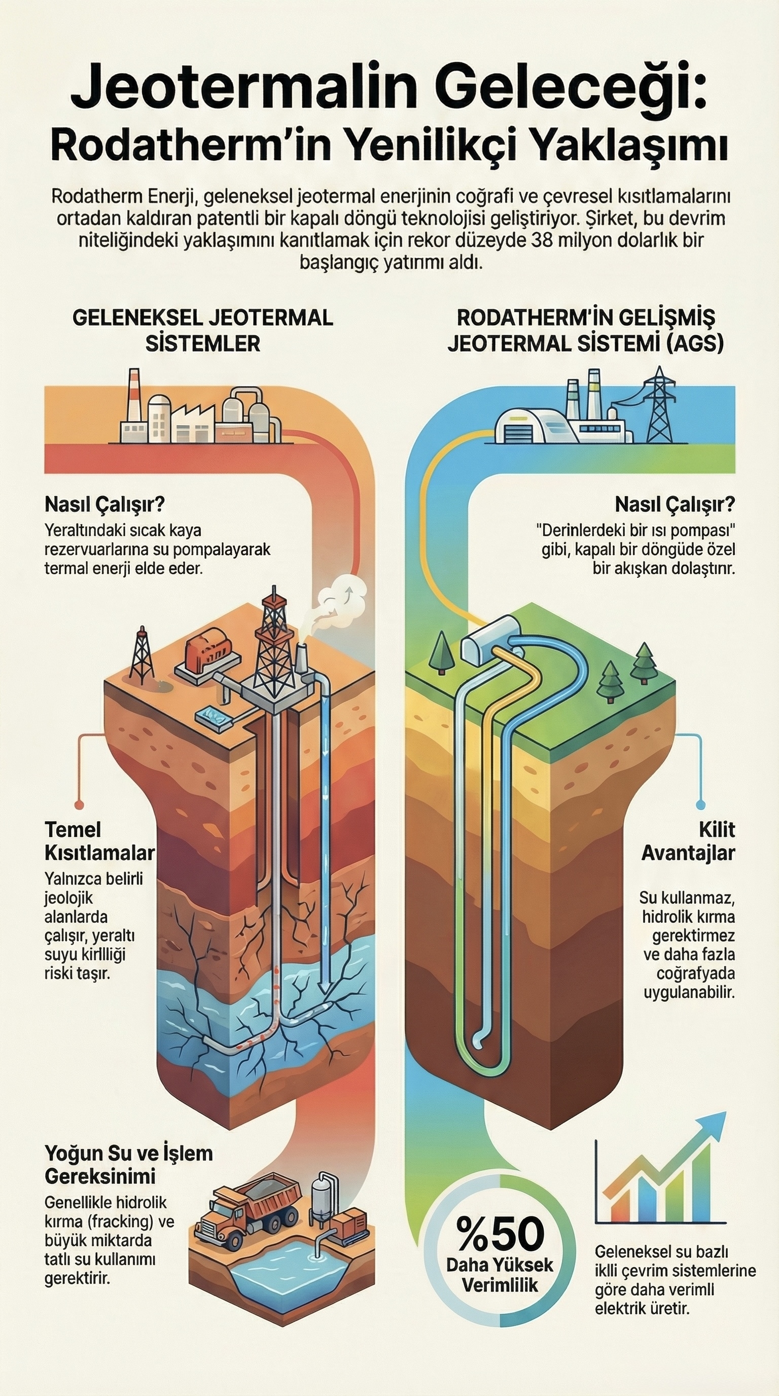 Bu sistem, başlangıçta daha yüksek bir birinci yatırım maliyeti gerektirse de düşük işletme masrafları ve yüksek verimliliği sayesinde uzun vadede kendini amorti edebiliyor. Çünkü su kullanımı olmadığı için çevresel riskler en az düzeyde. Klasik sistemlerde yüzeye geri dönen yüksek tuz oranına sahip korozif sular, boruların aşınmasına ve tıkanmasına yol açarak önemli bakım maliyetleri ve duruş müddetleri yaratabiliyordu. Rodatherm, geçmişte pazara girişte zorluk yaşayabilecek bir teşebbüs olarak görülebilirdi; lakin günümüzde yapay zeka dayanaklı data merkezlerinin bitmek bilmeyen güç talebi sayesinde kıymetli bir muvaffakiyet yakalayacak üzere görünüyor. Klâsik jeotermal santraller geniş arazi gerektirirken, bu sistemin çok daha az alan kaplaması sayesinde neredeyse her yere kurulabilmesi mümkün. Örneğin, jeotermal kaynaklar açısından varlıklı olan ülkemizde, Ege Bölgesi’nin büyük bir kısmının elektrik üretimine açılması teorik olarak mümkün görünüyor. Böylelikle her kentin yakınında, o bölgenin gereksinimini karşılayacak ölçekte üretim tesisleri kurulabilir ve güç nakil çizgilerinin bakım ve yatırım muhtaçlığı da azalabilir. Birebir vakitte organize sanayi bölgelerinde kooperatif temelli ortak üretim tesisleri kurulması da mümkün hale gelebilir.
