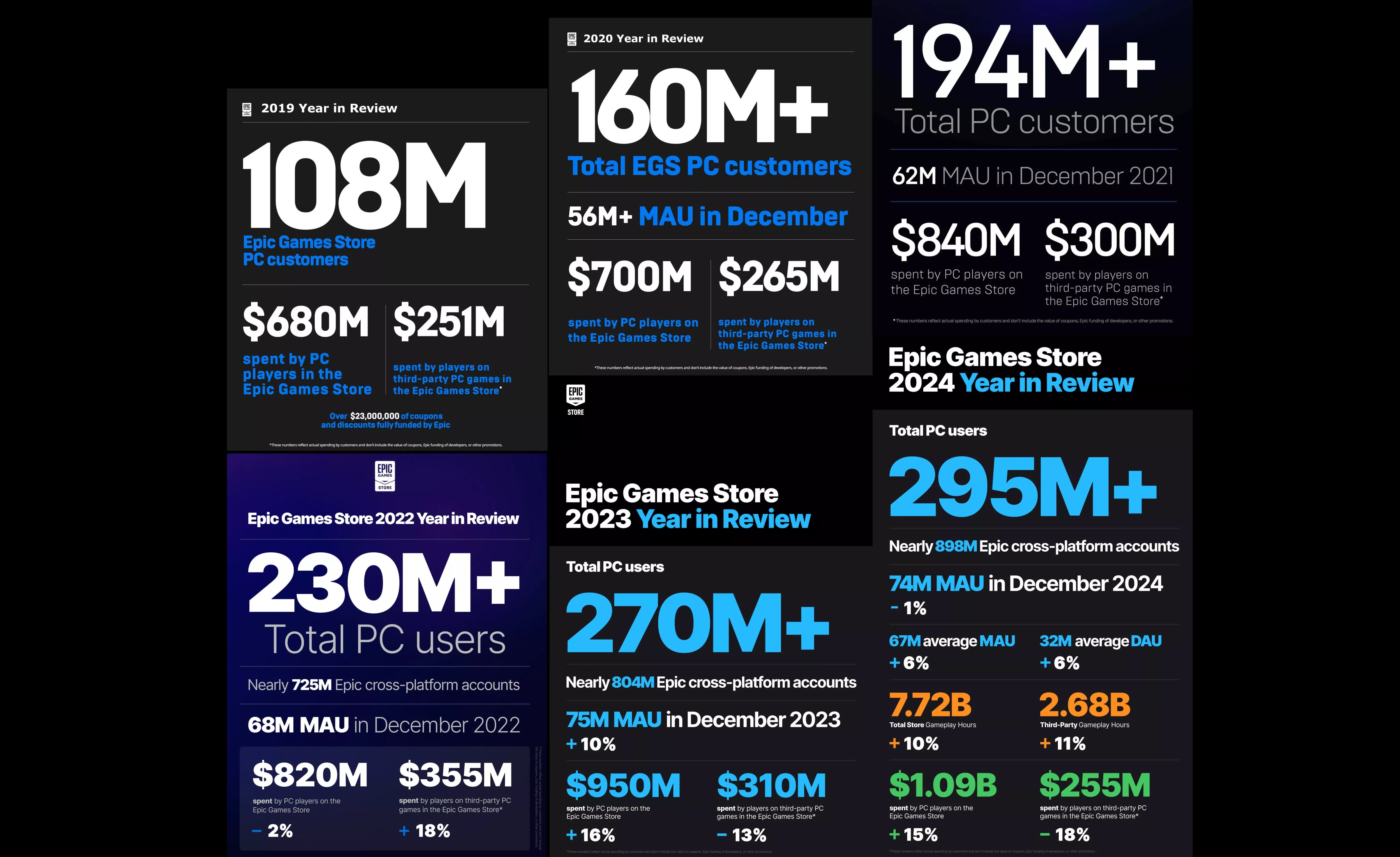 Ayrıyeten birebir periyotta Epic Games Store’un PC kullanıcı sayısı yüzde 173 artarak 108 milyondan 295 milyona ulaştı. Bilgiler, birçok kullanıcının mağazayı oyun satın almak yerine ücretsiz dağıtılan üretimleri toplamak için kullandığını düşündürüyor. Epic’in yüksek profilli özel oyun atılımları de beklenen etkiyi yaratmış görünmüyor. Toplam mağaza gelirleri ise farklı bir istikamette. Fortnite mikro ödemelerinin tesiriyle Epic Games Store’un toplam geliri 2019’dan 2024’e yüzde 60 artarak 680 milyon dolardan 1,09 milyar dolara yükseldi. Buna karşın üçüncü parti oyun satışlarının toplam gelir içindeki hissesi her yıl yüzde 50’nin altında kaldı ve 2022’den bu yana gerilemeye devam etti.