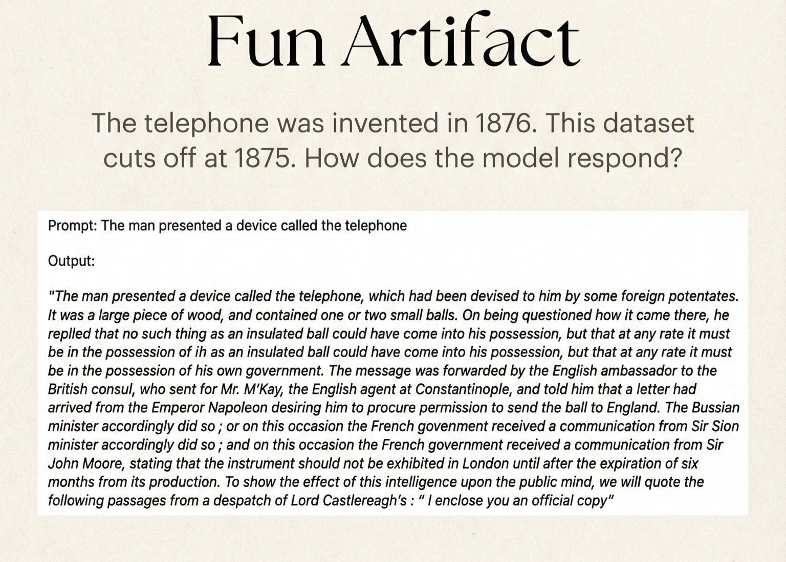 Ortaya çıkan en dikkat cazip örneklerden biri “telefon” sözüyle ilgili. Bildiğimiz üzere telefon 1876 yılında icat edildi ve modelin data seti bu tarihten çabucak evvel sona eriyor. Münasebetiyle model için “telephone” sözü, somut bir icattan çok belgisiz ve gizemli bir kavram. Kullanıcılar bu sözle ilgili bir komut verdiğinde, model bunu kimi vakit bâtın bir diplomatik aygıt, kimi vakit da devletler ortası haberleşmede kullanılan gizemli bir aygıt olarak yorumluyor. Yani çağdaş manasını bilmediği bir kavramı, kendi tarihi bağlamı içinde “mantıklı” bir yere oturtmaya çalışıyor.