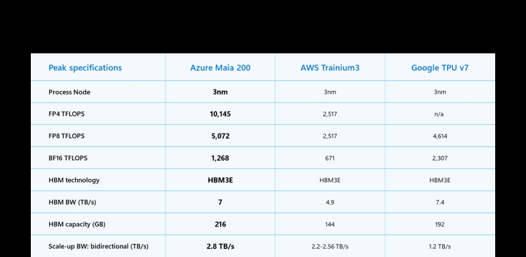 Microsoft, Maia 200’ü bugüne kadar devreye aldığı “en verimli çıkarım sistemi” olarak tanımlıyor. Şirketin paylaştığı bilgilere nazaran yeni çip, birinci jenerasyon Maia 100’e kıyasla dolar başına performansta yüzde 30’luk bir artış sağlıyor. Bu sav, Maia 200’ün teknik olarak selefinden yaklaşık yüzde 50 daha yüksek bir TDP pahasına sahip olmasına karşın dikkat cazibeli bir kazanım olarak öne çıkıyor. Maia 200, TSMC’nin 3 nanometre üretim süreci ile üretiliyor ve yaklaşık 140 milyar transistör barındırıyor. Microsoft’un paylaştığı bilgilere nazaran çip, FP4 hesaplamada 10 petaflop’a kadar performans sunabiliyor. Bu kıymet, Amazon’un Trainium3 tahliline kıyasla yaklaşık üç kat daha yüksek. Google’ın yedinci kuşak TPU’sunun ise FP8 performansının üzerine çıktığı belirtiliyor.