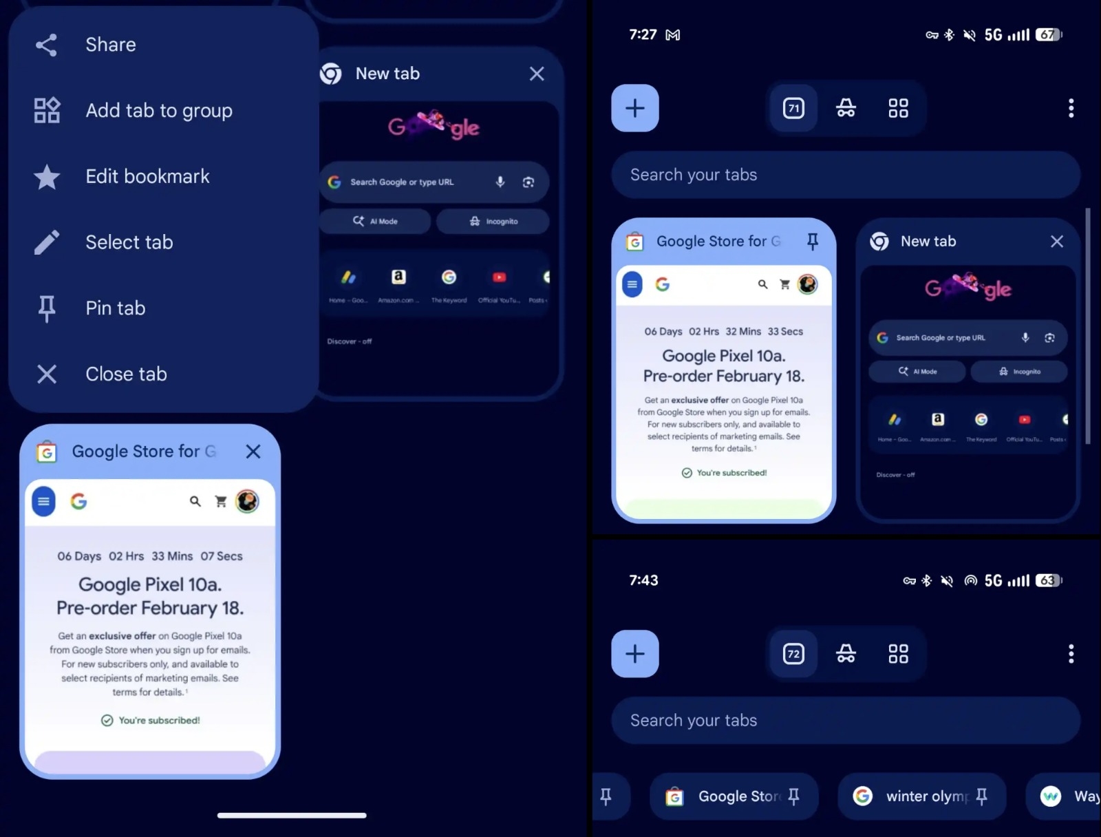 Google, Chrome Android sabitlenmiş sekmeler özelliğini Chrome 144 sürümüyle daha geniş çapta kullanıma sundu. Aralık ayında duyurulan bu özellik, taşınabilir tarayıcı tecrübesini masaüstü Chrome ile daha uyumlu hale getiriyor. Android kullanıcıları artık sık ziyaret edilen sayfaları sekme ızgarasının üst kısmına sabitleyebiliyor ve bu sekmeleri ezkaza kapatma riskini azaltabiliyor. İşte Chrome’un sekme ızgarasındaki yeni sabitleme sistemi: