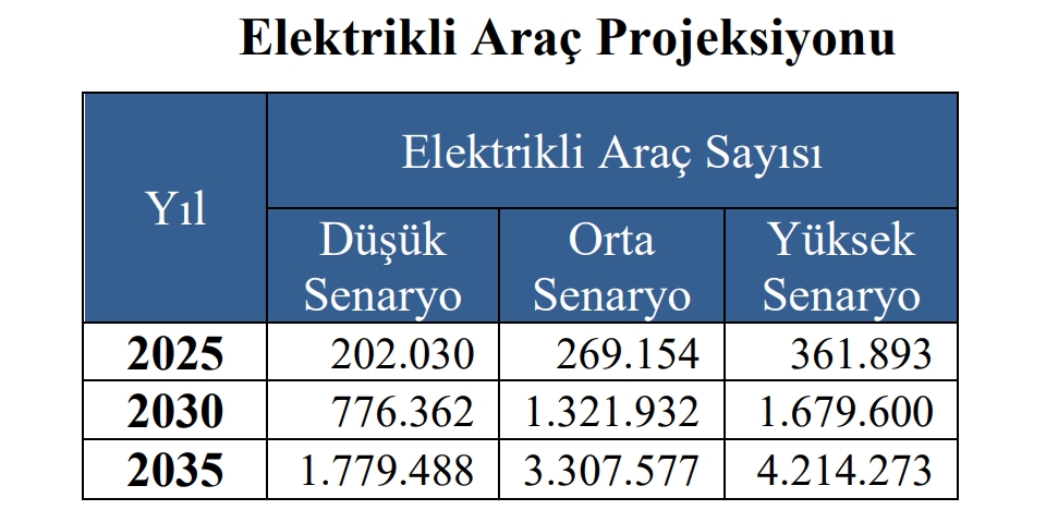 Öte yandan Güç Piyasası Düzenleme Kurumu’nun 2024 varsayım raporundaki yüksek senaryoya nazaran elektrikli araç sayısının 2025 sonunda 361 bin 893’e, 2030’da 1 milyon 679 bin 600’e, 2035’te ise 4 milyon 214 bin 273’e ulaşması bekleniyor. Bakanlığın 6 milyonluk projeksiyonu, düzenleyici kurumun en yüksek senaryosunun da üzerinde bir büyüme öngörüyor. 2035’te tüketim 510 TW saate çıkabilir