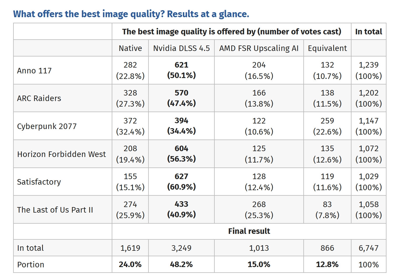 Karşılaştırmada Anno 117, ARC Raiders, Cyberpunk 2077, Horizon Forbidden West, Satisfactory ve The Last of Us Part II üzere farklı grafik karakterine sahip imaller kullanıldı. Sonuçlara nazaran DLSS 4.5 tüm oyunlarda en çok tercih edilen seçenek oldu. Sadece Cyberpunk 2077’de mahallî çözünürlükle neredeyse başa baş bir tablo oluştu. Buna karşın DLSS 4.5 burada da küçük bir farkla öne çıkmayı başardı.