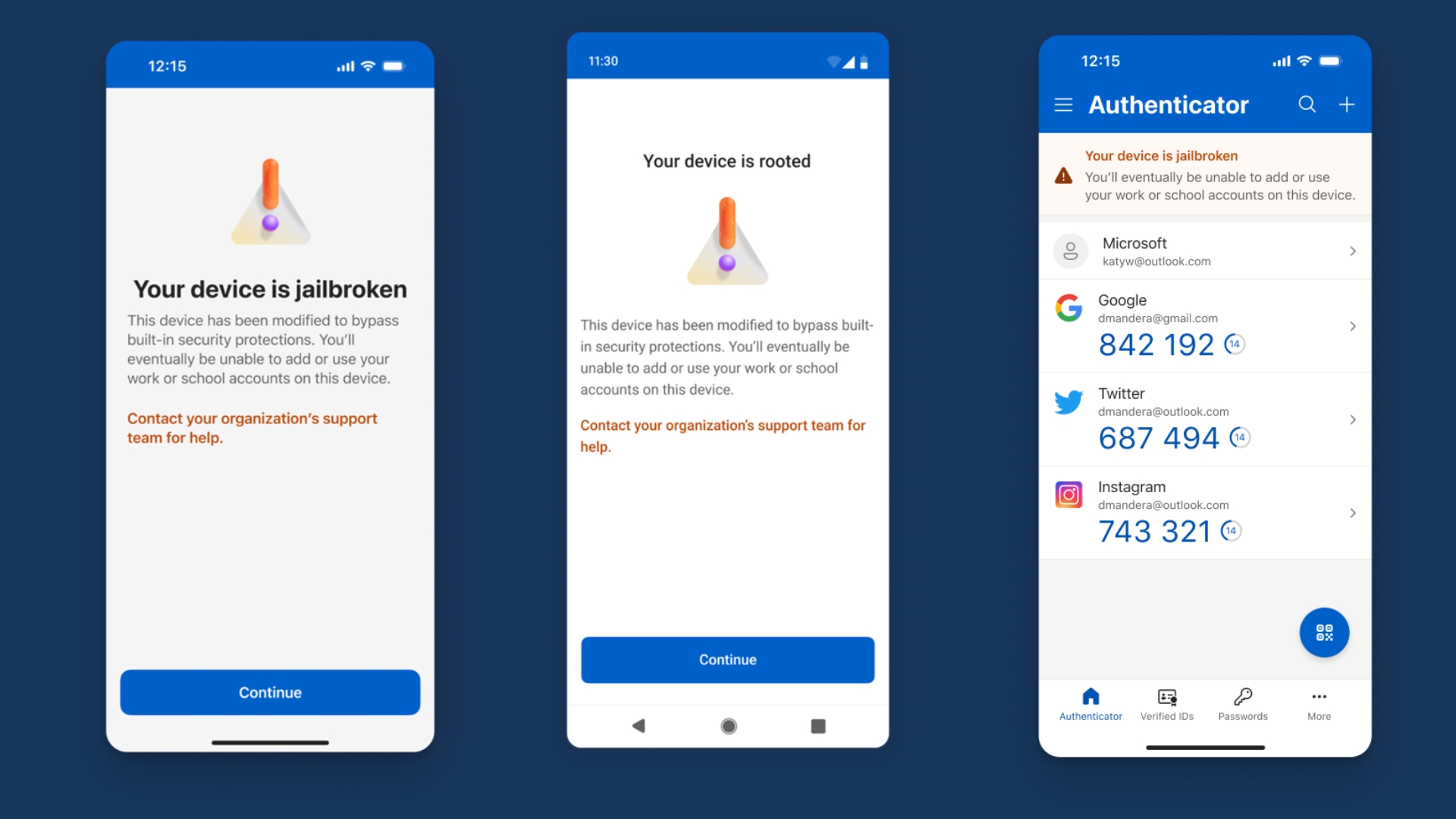 Uyarı modu, kullanıcılara Microsoft Authenticator için jailbreak yapılmış telefonları kullanmamaları konusunda bilgi verecek. Uygulama, “Cihazınız jailbreak yapılmış. Bu aygıt, yerleşik güvenlik muhafazalarını atlatmak için değiştirildi. Bu aygıtta iş yahut okul hesaplarınızı ekleyemeyecek ya da kullanamayacaksınız.” ihtarını gösterecek.